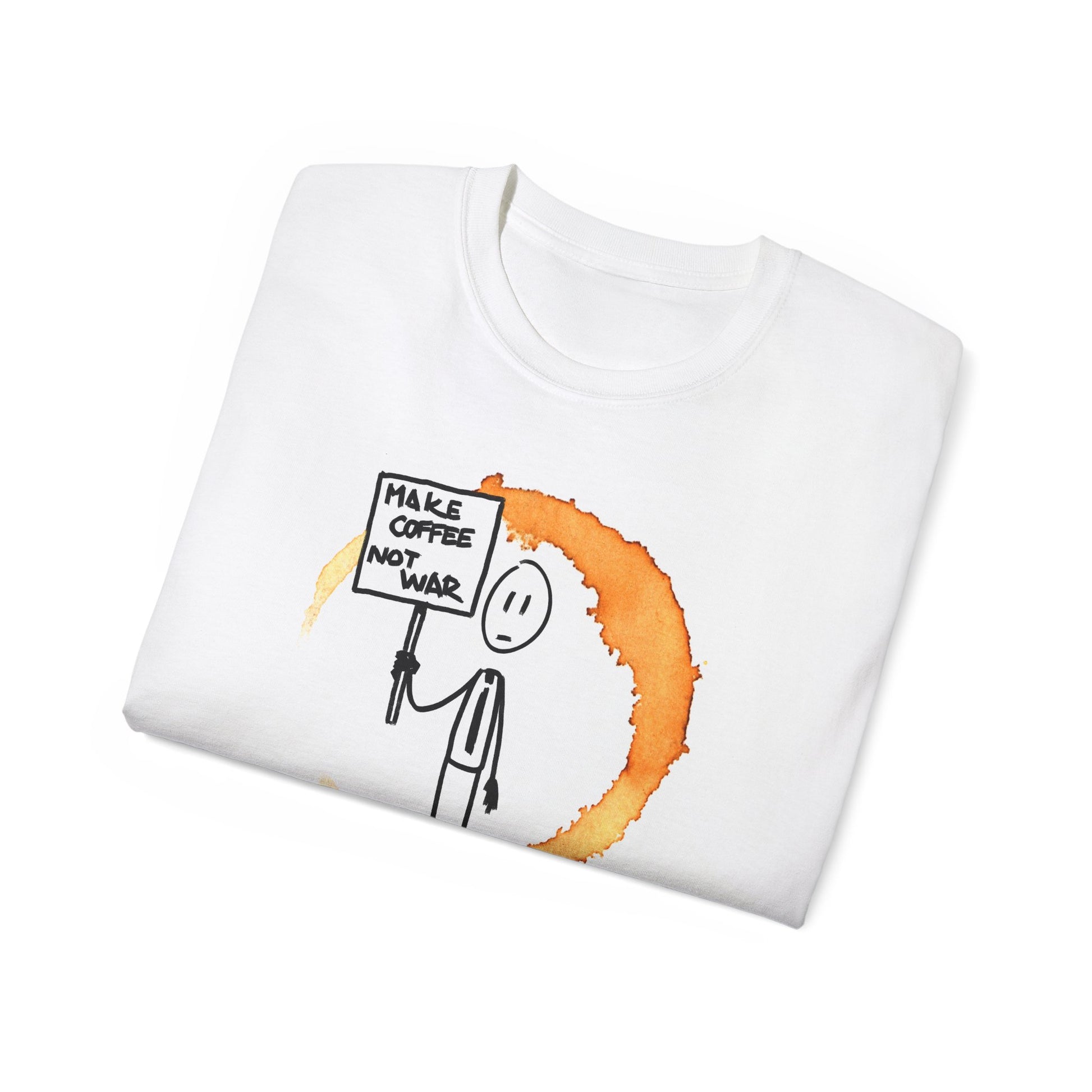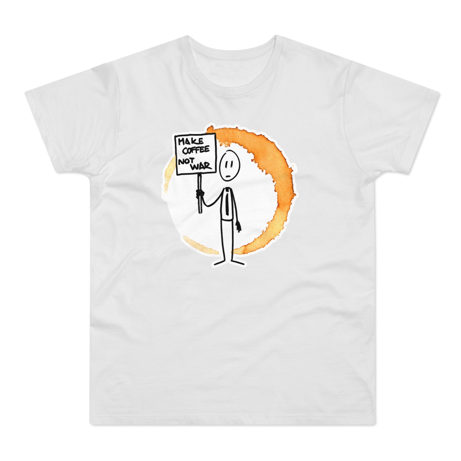 Bílé unisex tričko s potiskem Make Coffee Not War odkazuje na starý hippie slogan "make love, not war", momentálně opět aktuální téma...