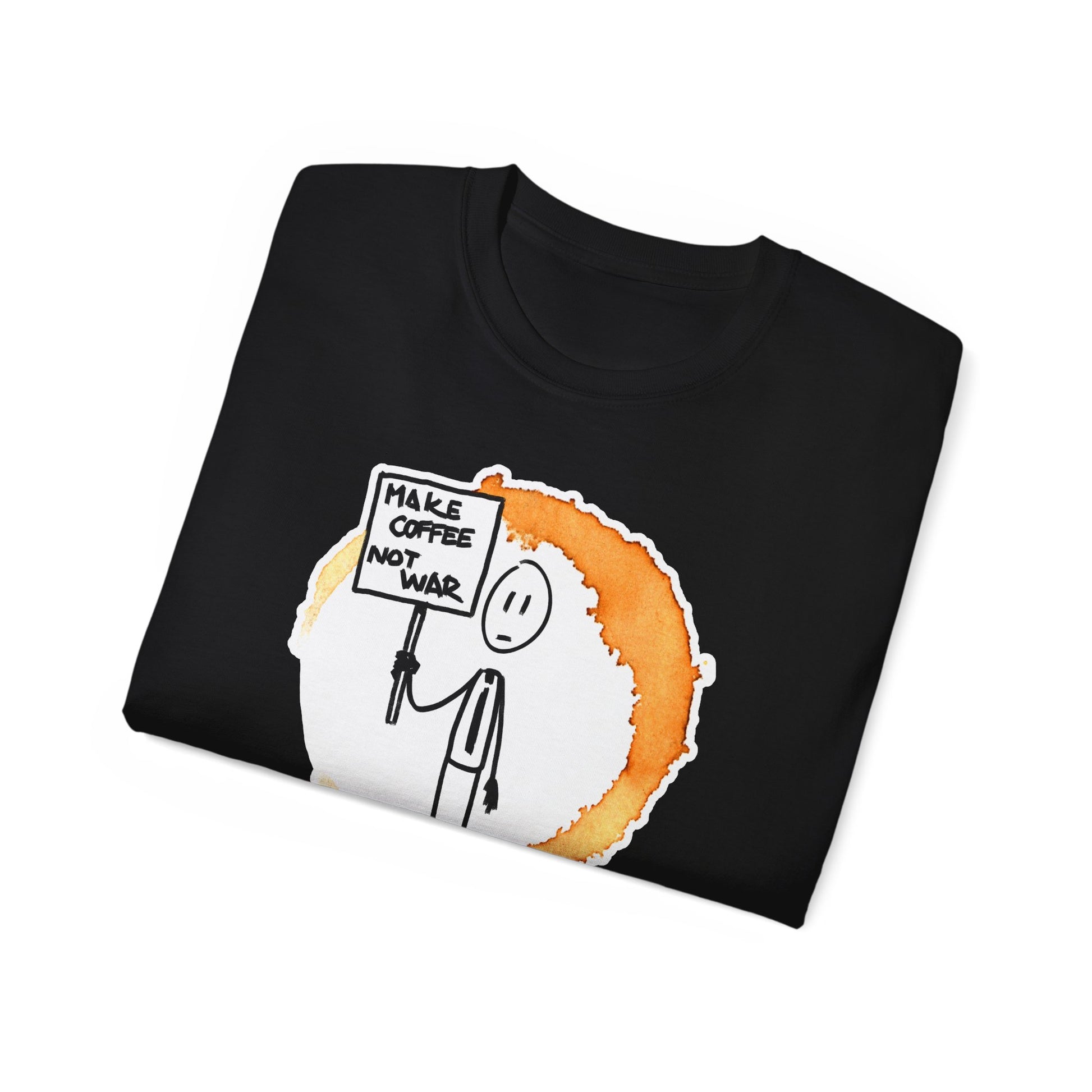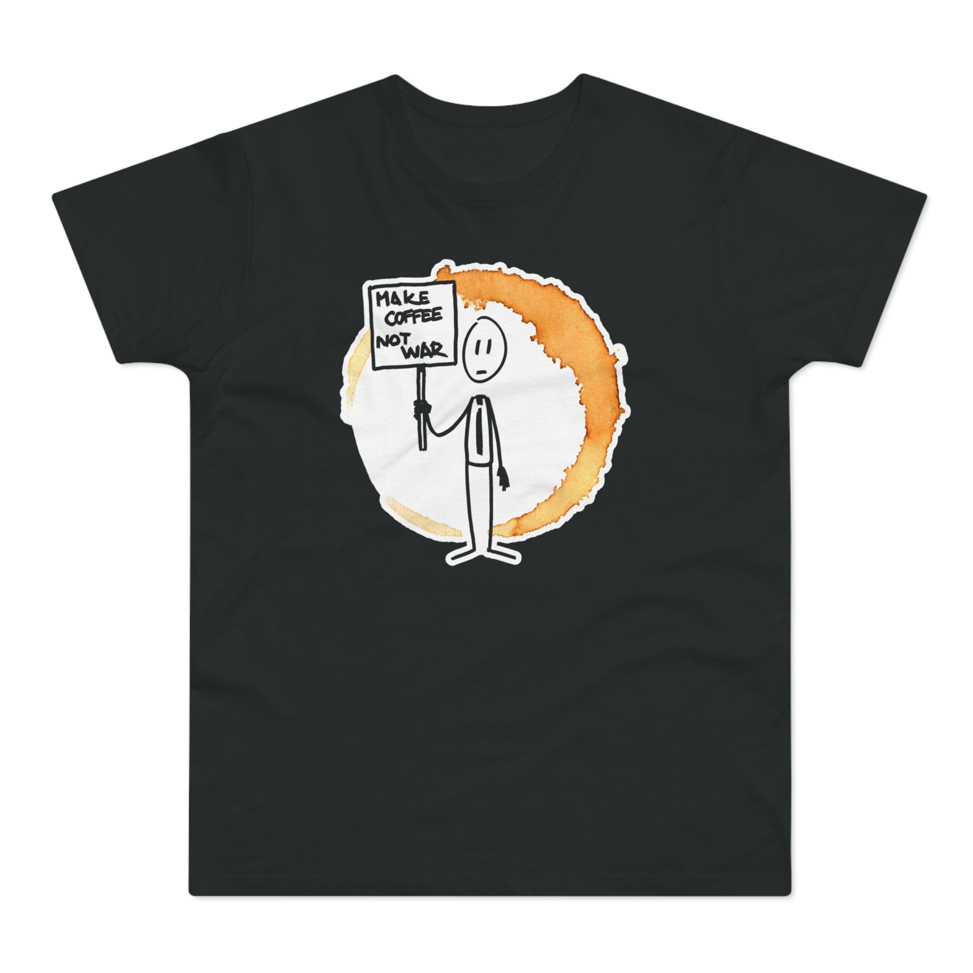 Černé unisex tričko s potiskem Make Coffee Not War odkazuje na starý hippie slogan "make love, not war", momentálně opět aktuální téma...